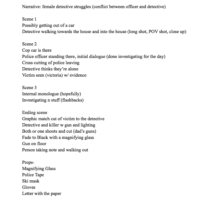 We started drafting some possible ideas for our title sequence. As of right now, our video will follow alongside a detective who is solving a murder but faces many obstacles and complications while figuring out the crime. We compiled our ideas, props, and possible camera angle shots onto a google doc that I have attached a picture of. These ideas are subject to change as this is only a rough draft. We will continue to brainstorm ideas for this project until the storyboarding and preparation for shooting phases. Prior to research, we would identify our title sequence as one representing a few different genres, including drama, crime, horror, and thriller. It will contain elements of all of these genres, but a more detailed analysis of genre conventions will be discussed later in the research phase. My partner and I both had an interest in shooting a title sequence centered around a mystery storyline. Personally, mystery has always been a favorite genre of mine, both in books and movies, so I was really excited to incorporate this into an academic project. When we started to draft ideas for the plot of the video, we were easily able to come up with the title because we felt that it represented a detective’s purpose in solving a mystery, which is to delve deep into the truth of the matter. As I said earlier, we know the basic plot line of our title sequence, but we still have questions about how to structure it together to display our visions. Our goal is to make it the essence of a mystery movie, with suspenseful elements that may even be a scare to the viewers. With our upcoming research on genre conventions and analyzing other title sequences of movies under these genres, I feel that we will be able to better envision these ideas into a reality.